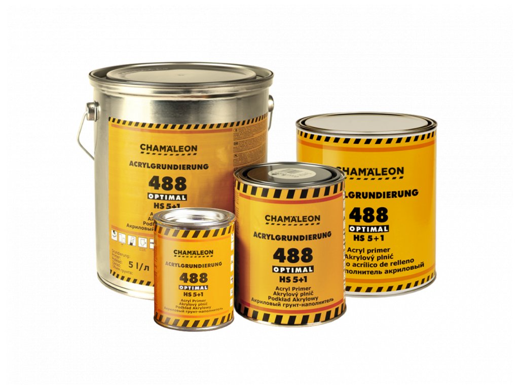 Chamäleon Akrylový plnič 488 HS 2,5 l Šedý je profesionální 2K akrylový plnič s vysokým obsahem sušiny (HS) a poměrem míchání 5 : 1 s odpovídajícím tužidlem. Poskytuje vynikající plnící schopnost, vysokou přilnavost na ocel, pozink, hliník, reaktivní základy, polyesterové tmely i staré dobře držící laky a současně zajišťuje antikorozní ochranu podkladu.