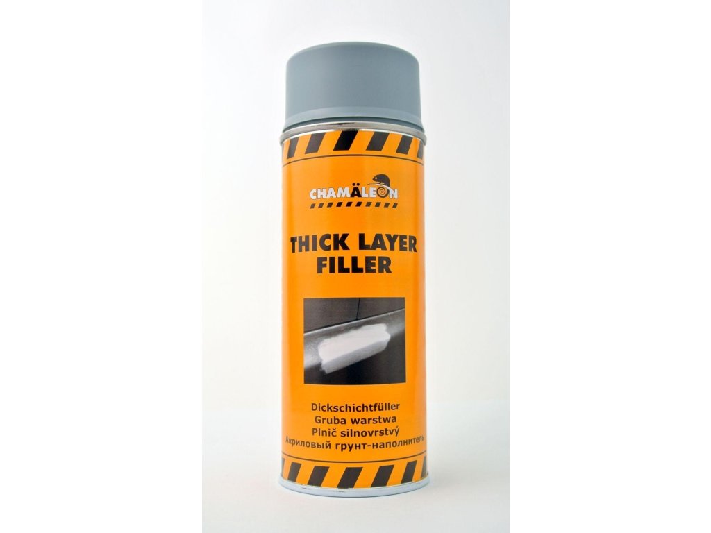 Chamäleon Plnič silnovrstvý 400 ml je jednosložkový akrylový sprejový plnič s vysokým obsahem pevných látek určený pro silné vrstvy (až 200 μm) při opravách karoserie, kde je potřeba vyplnit hlubší škrábance, důlky a povrchové defekty na kovových podkladech, oceli, hliníku a starých nátěrech. Nabízí vynikající plnící vlastnosti, antikorozní ochranu, rychlé schnutí (10-20 minut mezi vrstvami) a snadnou brousitelnost po úplném vytvrzení.